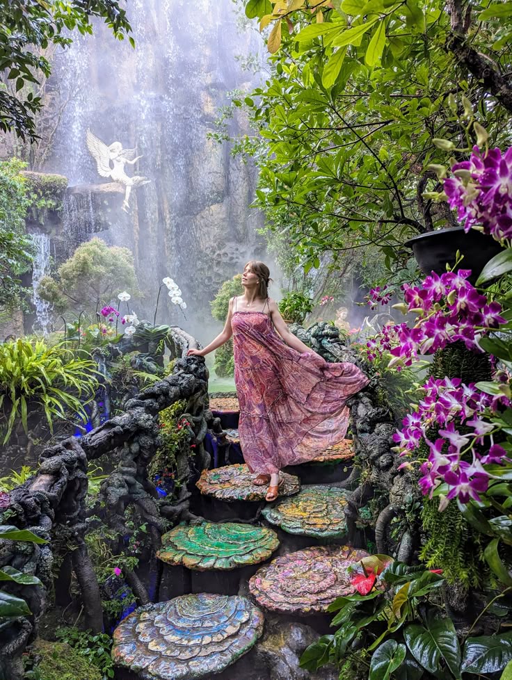 Walk through lush gardens, bamboo pathways, and misty waterfall scenery